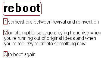 Others would just see "reboot" as primarily a financial move for producers and publishers due to global recession, while for authors it's just an experimental attempt, a tinkering of past creativity like a circus move, tiptoeing on a very sharp edge of a sword. But the people's verdict is still, out there. Producers must never count the consumers out since people are becoming smarter. We just have to wait if this trend will turn out good or until reaching a saturation period (3-5 years from now) when the need for a new trend is imminent. Waiting for a resolution, perhaps?